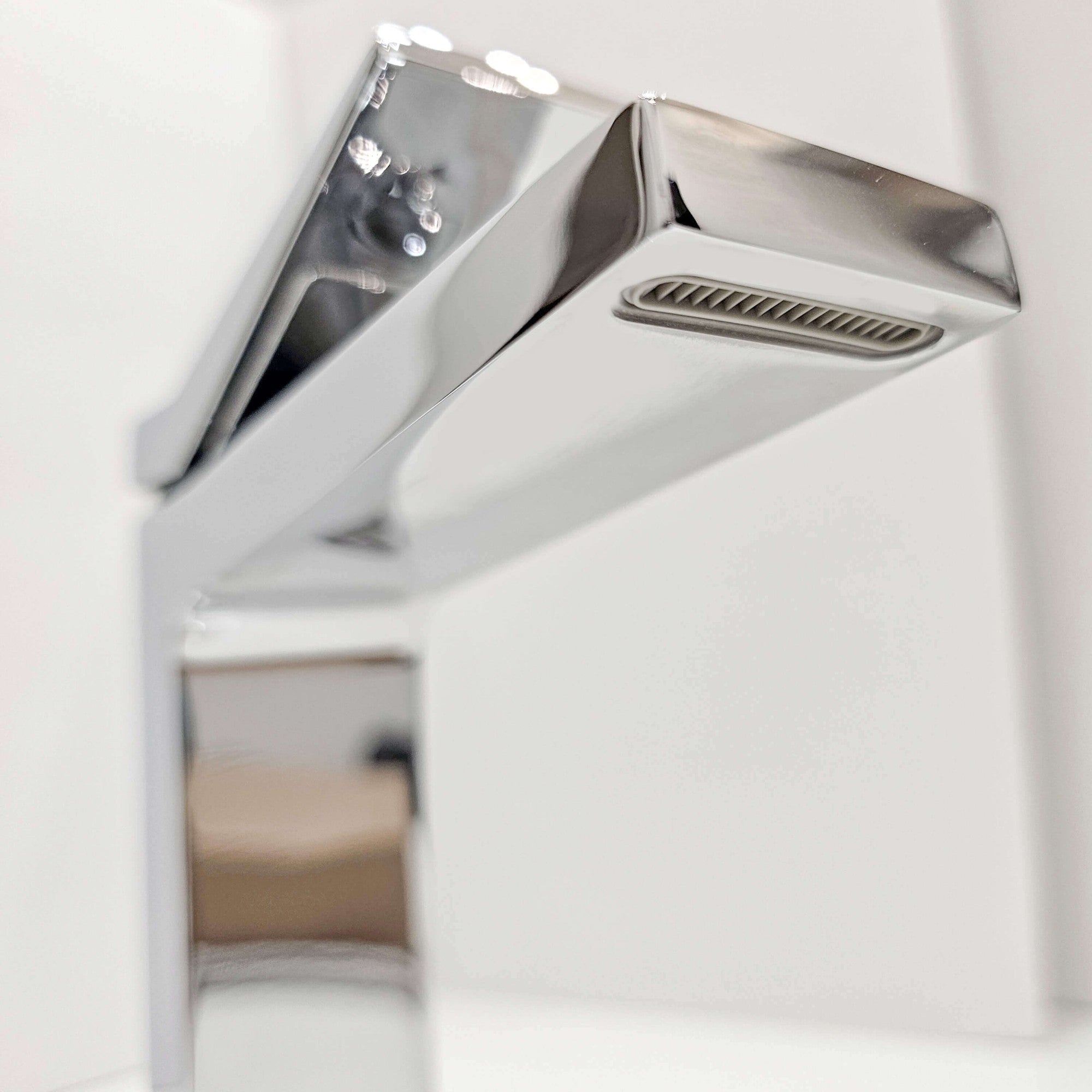 - Tipo de bica: Baixa com formato cascata, ideal para cubas de bancada ou sobrepor.