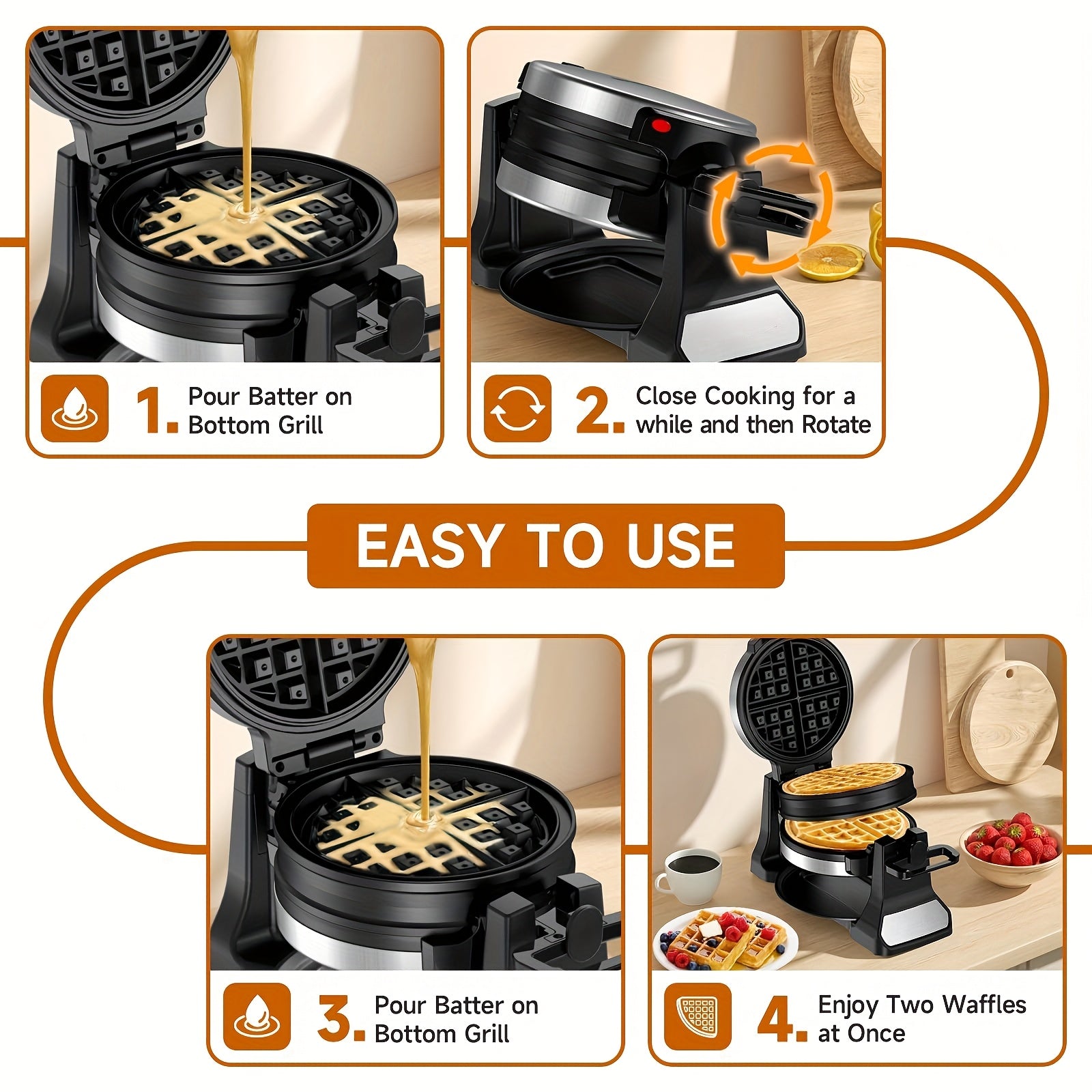 Máquina de Waffles Belgas Dobrável 180 Graus 1400W 8 Porções