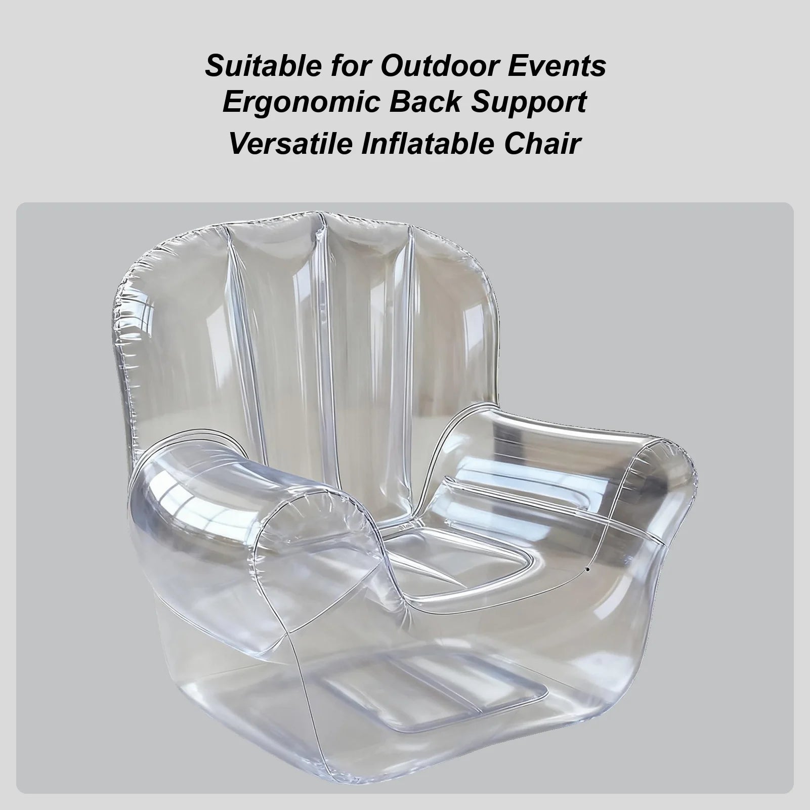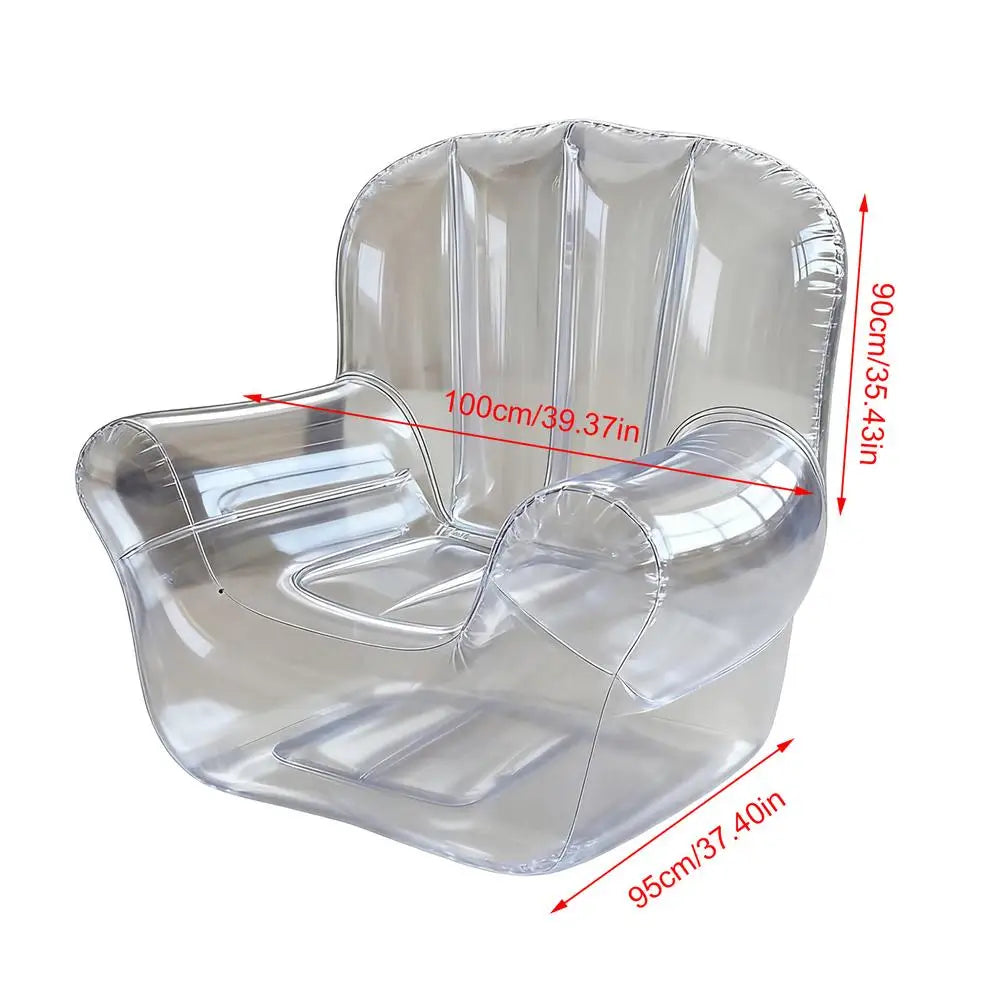 Confeccionado em PVC transparente de alta qualidade, este sofá inflável oferece apoio estável para adultos, mantendo uma estética discreta e sofisticada. Perfeito para sessões de leitura, convívios com amigos ou momentos de relaxamento no quarto ou na varanda.