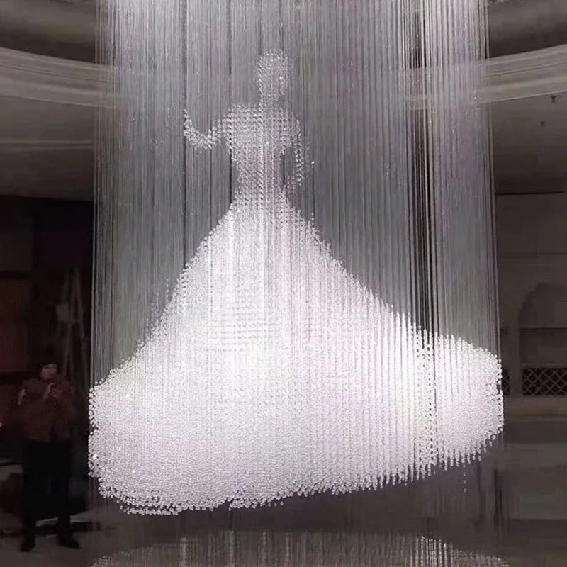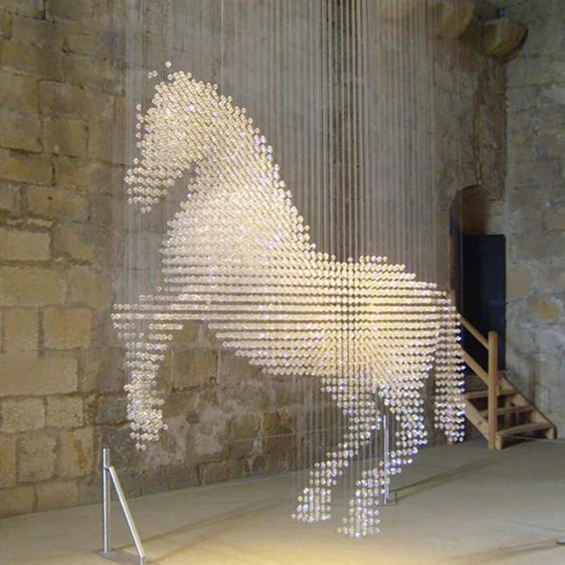 Esta escultura de cavalo personalizada em formato de pingente de cristal foi pensada para realçar lobbies de hotéis, villas e salões de beleza, combinando arte e iluminação em um único elemento. Ideal para espaços que procuram presença marcante com um toque contemporâneo.