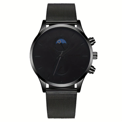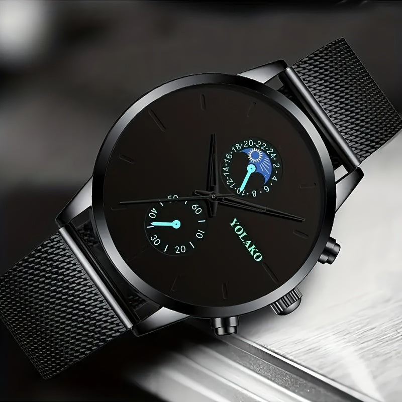 Relógio masculino preto com pulseira de malha de aço – Quartzo que combina elegância contemporânea com funcionalidade prática. Um acessório pensado para o ritmo urbano, com precisão confiável e leitura rápida da hora.